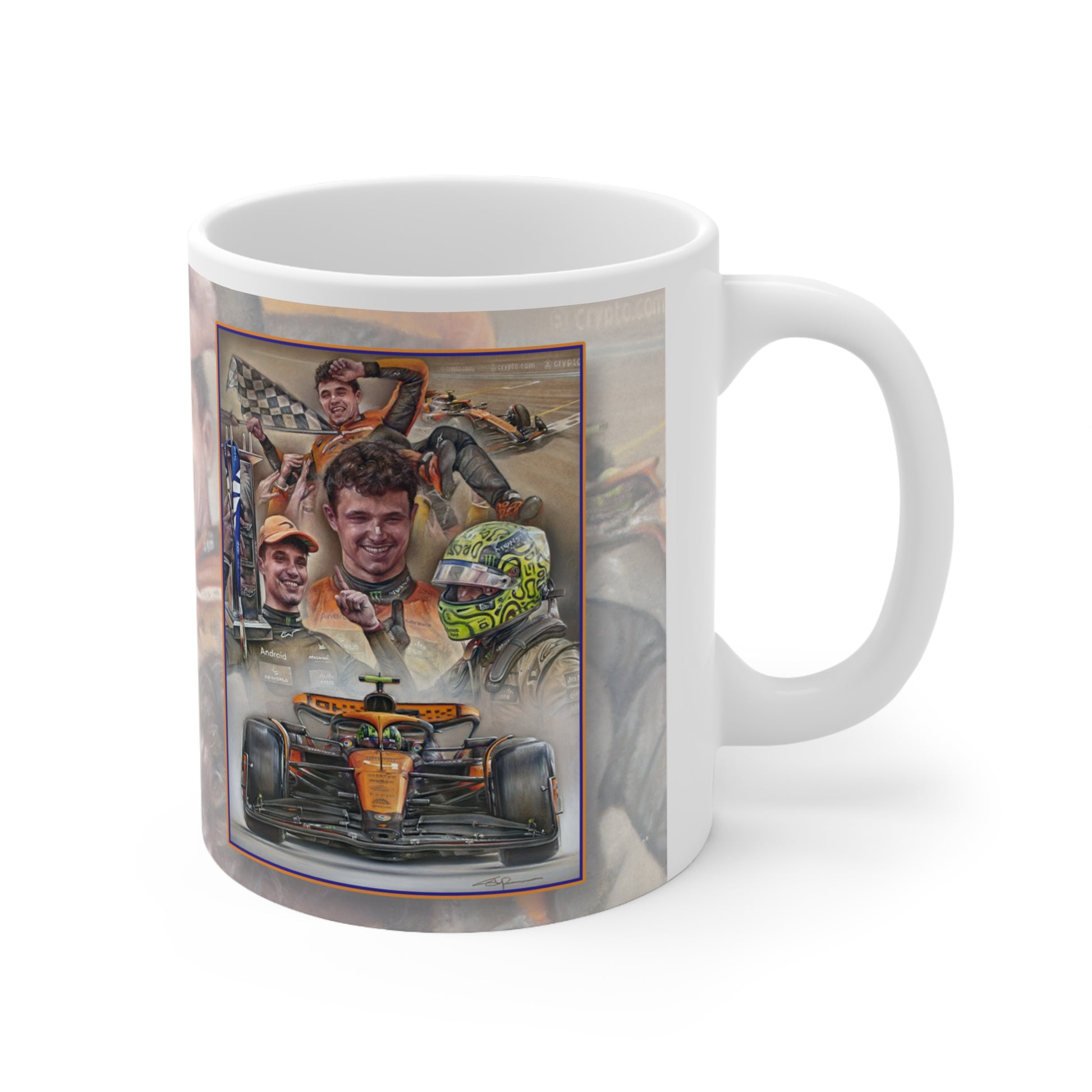 This Lando Norris 11 oz ceramic mug features Stephen Doig's montage artwork